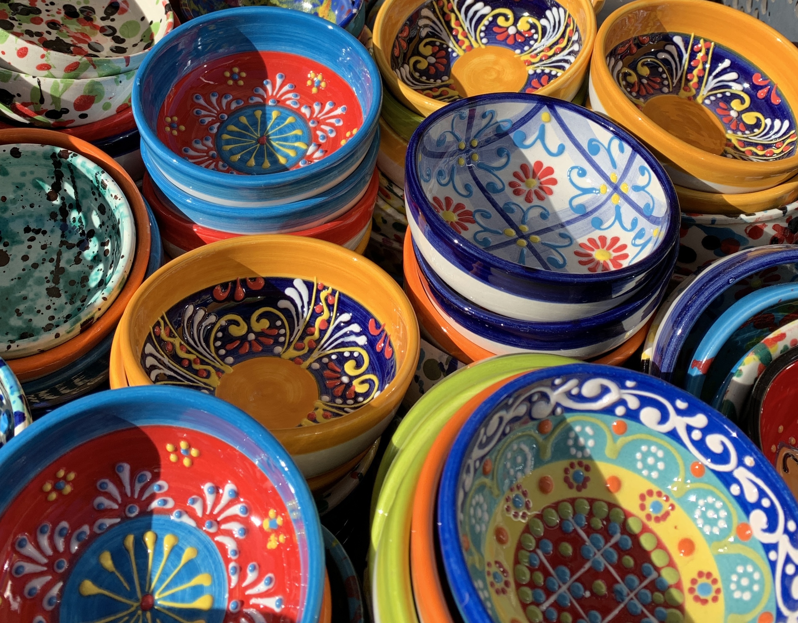 I made it to the Thursday market in Torre del Mar and it was quite large. I found it interesting the mix between food, spices and clothes. The scent of leather goods from the purses and the belts hanging wafted from tent rafters. The overall environment was fun and the vendors yell and try to draw you into their tents. I love the colours of the ceramics, spices and fruit. I didn’t buy anything that day. This is the beauty of slow travel. You are able to pick and choose and you can always return. Next Thursday I will return and I will pick up some of those amazing Sevilla oranges, strawberries and asparagus.